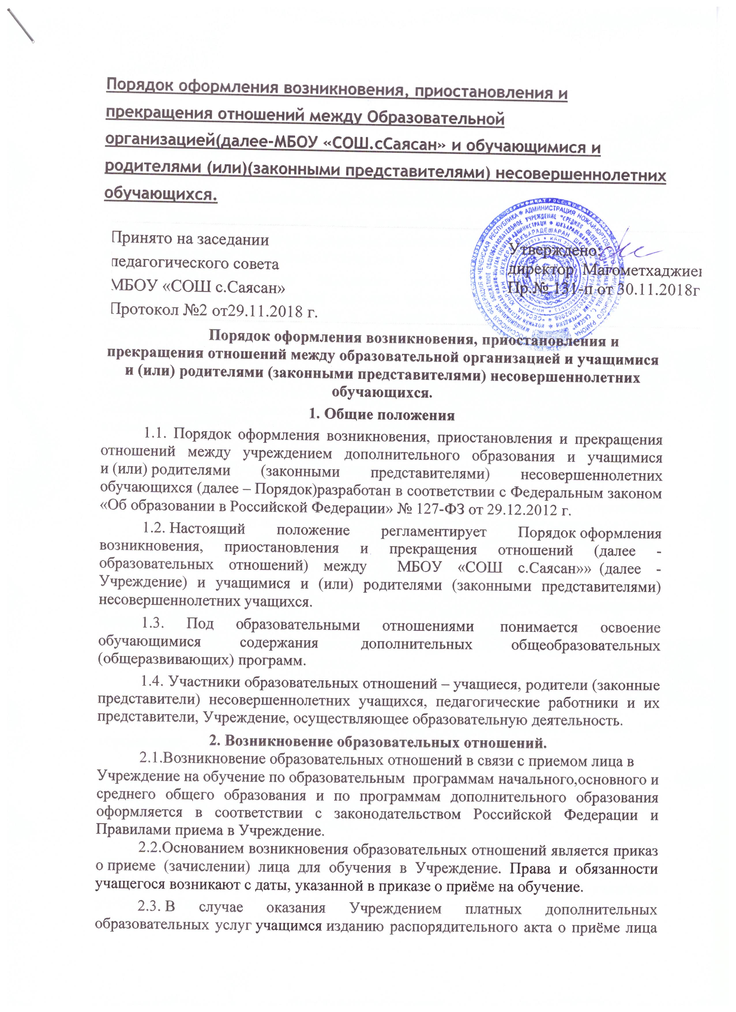 Порядок оформления возникновения, приостановления прекращения отношений между образовательной организацией и учащимся и (или) родителями (законными представителями)несовершеннолетних обучающихся