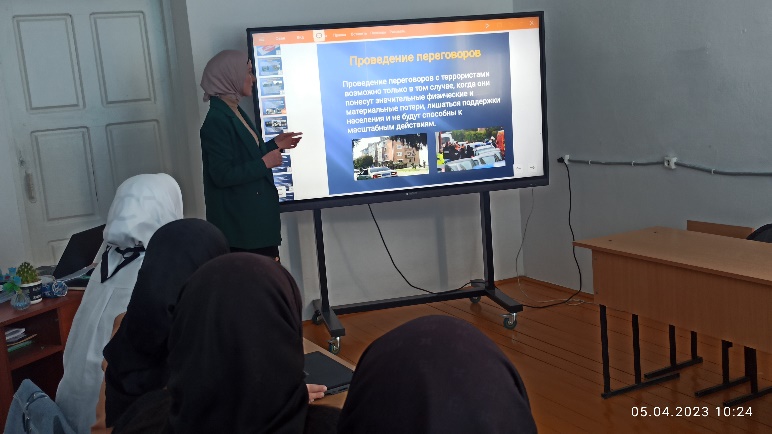 07.02.202407.02.2024г. в 11 классе классным руководителем (заместителем по ВР) З.А.Исмаиловой проведена беседа с показом презентации на тему: «Чужого горя не бывает», где было отмечено, что любой террористический акт, война — это боль, слезы, горечь. Это страшное потрясение для здравомыслящего человека. Страдают ни в чем неповинные люди. Охват 6чел.